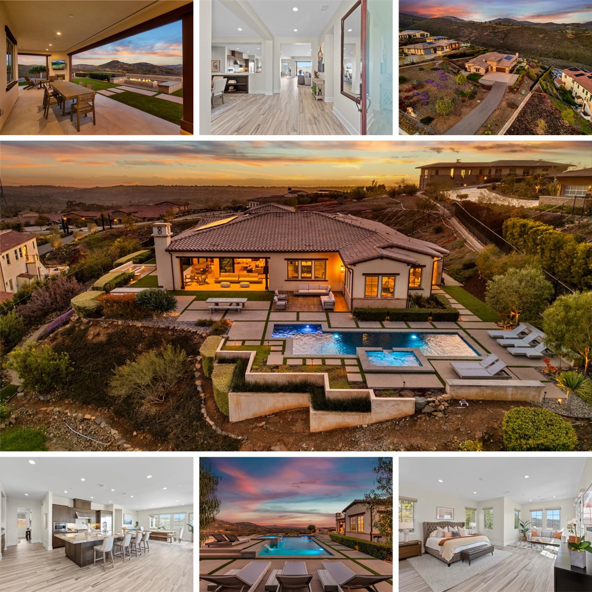 Pure luxury set on an elevated 1.11- acre view lot, this stunning highly upgraded single-level home offers breathtaking panoramic mountain vistas, ocean views and sunsets. A private long driveway leads to the gated grand courtyard entry with fireplace and seating. The light & bright open floor plan offers; 4 car garage, 10 foot ceilings, large dining room/bar equipped with dual wine fridges, chefs kitchen with top of the line Thermador appliances and dual dishwashers, luxurious stone and marble counters and backsplash, spacious butler pantry with refrigeration, storage cabinets, a sink and large pantry. The oversized island has seating for 8, opening up to a grand great room and additional dining room with oversized multi stacking glass doors that capture the sweeping views all around and seamlessly blends the indoor outdoor living. Outside in the resort style yard you will find a large wrap around lanai with plenty of space for entertaining/living, TV/fireplace wall, and alfresco dining. A modern salt water pool & spa with waterfalls, built in BBQ island with bar seating, large fire pit with banquet seating and steps that lead down to a tranquil yoga grass area. This very special home seamlessly merges modern sophistication with the surrounding natural beauty. Retreat to the generously sized luxurious primary suite, where stunning mountain views surround, the spa-inspired primary bath offers dual vanities, a soaking tub, a walk-in shower, a private outdoor shower and an oversized walk-in closet with custom cabinetry. Down the hall you will find a guest suite that features sliding glass doors that open to a covered lanai, offering a peaceful retreat for visiting guests. A versatile bonus room, perfect for an office or a 5th bedroom, and an additional two other great sized bedrooms with en suite baths, generous sized laundry room with loads of cabinets for storage. A fully outfitted garage gym, owned solar, located in a top rated school district. This home really has it all!